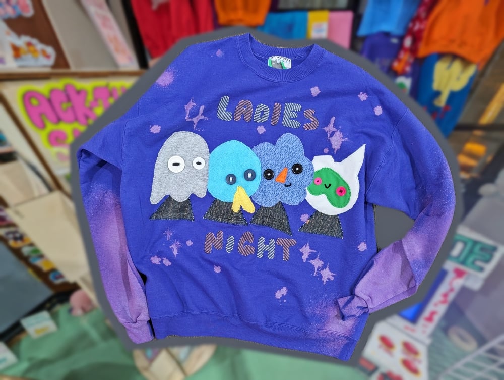 royal purple sweater with a stitched design of my original characters; ollie, jenjen, bink, and pepe. these are my current cast of female characters surrounded by embroidered text that reads 'ladies night'. the sleeves have been dipped in bleach to give them a slightly more pastel color. bleach has also been sprayed and painted on the front of the sweater to create the illusion of stars. this original design has been handsewn by me using new and slightly used fabrics.